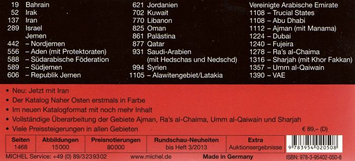 Abu Dhabi, Aden/Gebiete, Ajman, Ajman-Manama, Alawiten-Gebiet, Bahrain, Dubai, Fujeira, Hedschas, Irak, Israel, Jemen (Nordjemen), Jemen (Königreich), Jemen (Republik), Jordanien, Kuwait, Latakia, Libanon, Nedschd, Oman (Sultanat), Palästina, Palästina Autonomiegebiete, Qatar, Ras al-Khaima, Saudi-Arabien, Sharjah, Sharjah/Kohr Fakkan, Südarabische Föderation, Südjemen, Syrien, Syrien (VAR), Trucial Staaten, Umm al-Kaiwain, Vereinigte Arabische Emirate.